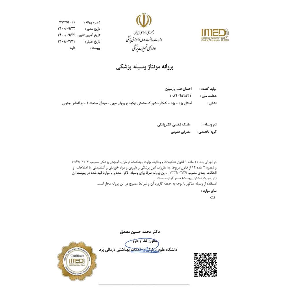 | ۳ | تاییدیه ها | تهیه شده مطابق استاندارد ملی ماسک پزشکی بریتانیا BS EN14683:2014دارای تاییدیه آزمون فیلتراسیون عوامل بیماری زا با کارایی بالای ۹۹% از آزمایشگاه نلسون آمریکادارای تاییدیه آزمون فیلتراسیون آلاینده ها با کارایی بالای ۹۹% از آزمایشگاه نلسون آمریکا | ||
