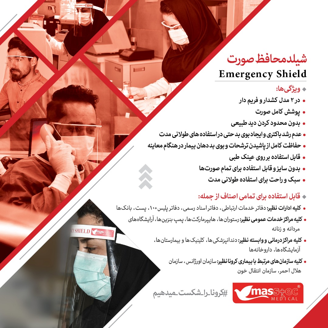 شیلد محافظ صورت جهت محافظت از پاشش ذرات به صورت افراد استفاده میشود.این نوع شیلد قابلیت استفاده در طیف بزرگی از افراد از قبیل پزشکان و دندانپزشکان،پرستاران،کارمندان ادارات و بانک ها ،معلمان و دانش آموزان میباشد.