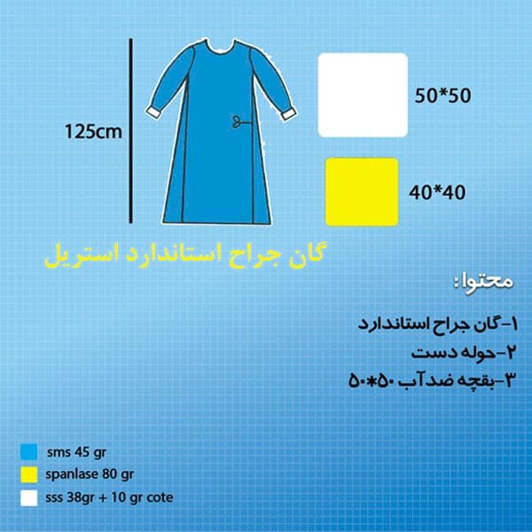 نوع پارچه: یک لایه اسپان باند 40 گرم لمینت شده با فیلم تنفسی از جلو و آستین ها،پشت گان اسپان باند 40 گرم