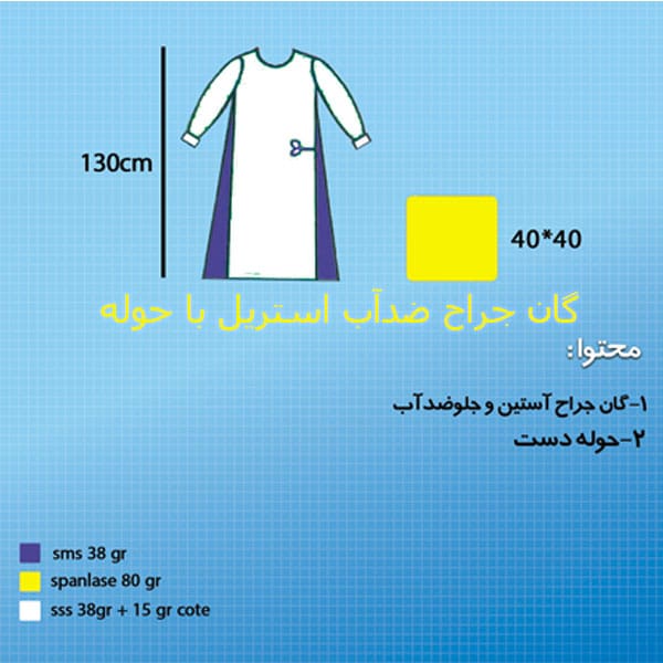 نوع پارچه: 2 لایه اسپان باند لمینت شده با یک لایه فیلم تنفسی از جلو و آستین ها،پشت گان اسپان باند 40 گرم